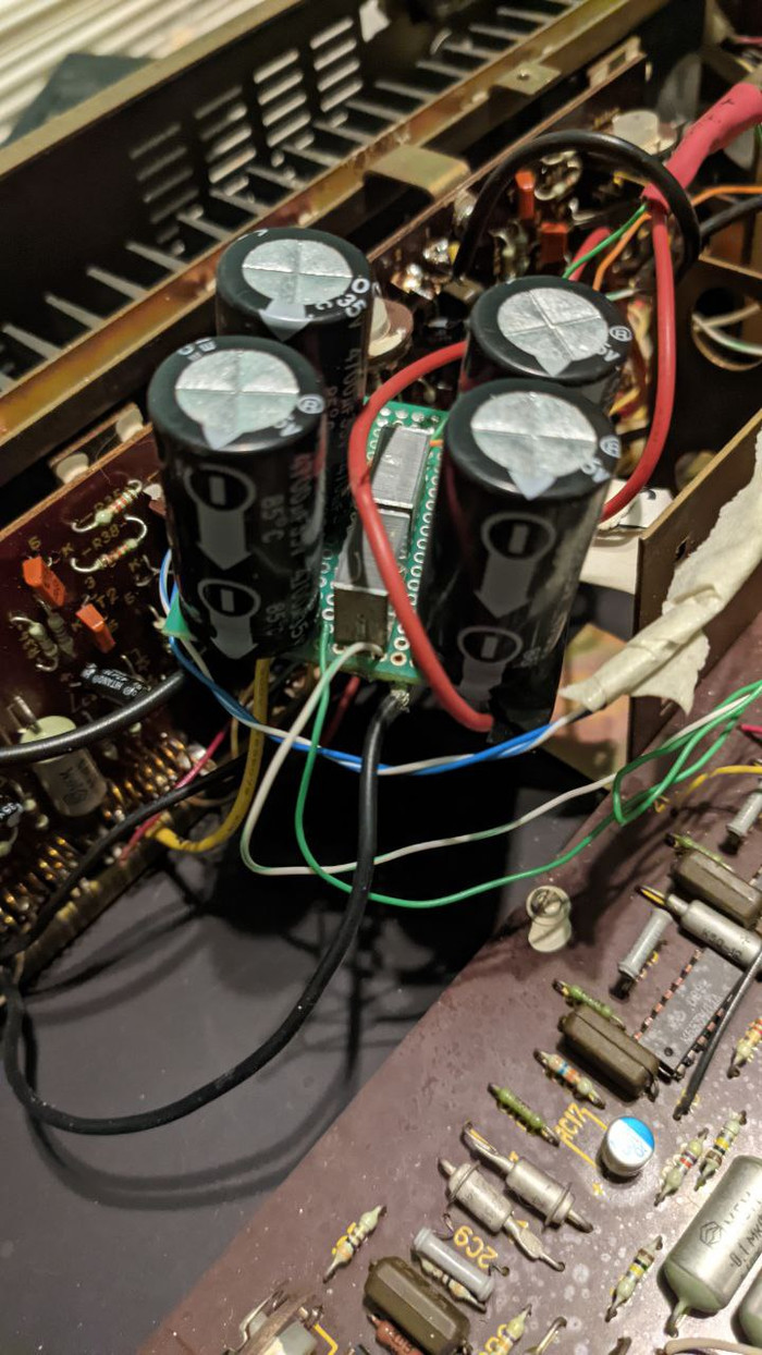 Внутри вместо двух конденсаторов на 5000мкф на каждое плечо питания стояло по 10000мкф на отдельной платке. Может быть и оправданное решение, но не когда они закреплены на один винт и свободно болтаются внутри корпуса. Плюс, вместо нормальных проводов прошлый владелец использовал витую пару. Мягко говоря не лучшее решение, к тому моменту, как до меня этот аппарат доехал - половина витухи просто сломалась у пайки. Ах да, никакой цветовой кодировки конечно же, меня очень удивила красная земля.