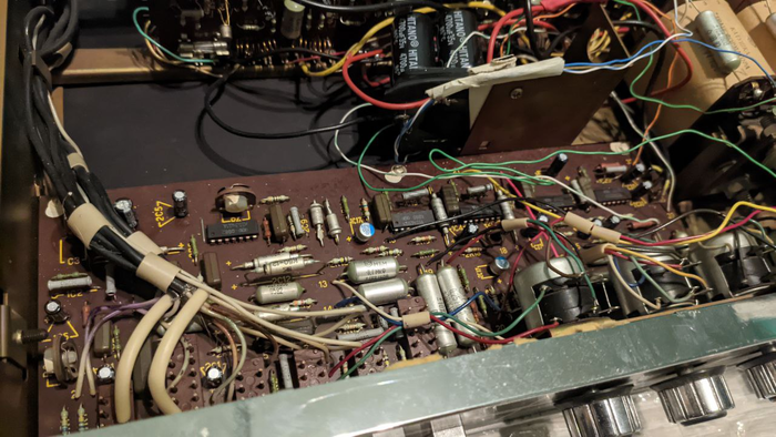 История аппраратов, как я понял, была такая - где-то в 2013 году прошлый владелец купил усилитель с хорошей внешкой и решил реставрировать, но что-то пошло сильно не так и потребовался донор, с внешкой уже похуже. От него отняли плату оконечника и заменили.