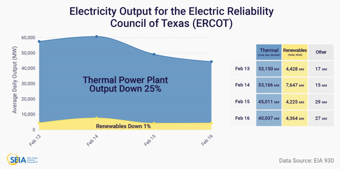По данным Совета по надежности электроснабжения Техаса (ERCOT), снижение выработки ветряной и солнечной энергетики в середине февраля не оказало заметного влияния на поставки электричества в распределительные сети штата. В случившемся коллапсе виновато снижение генерации с использованием газа и угля. В ночь с 14 на 15 февраля «ископаемая» генерация упала на 25 %, тогда как «зелёная» снизилась на 1 %.