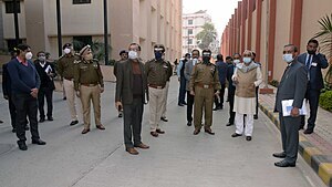 На фото Нитиш Кумар беседует с высокопоставленными полицейскими чиновниками штата во время осмотра Сардар Патель Бхаван, Патна