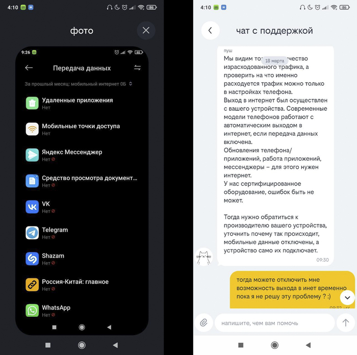 17го марта заметил списания денег со счёта, за использование моб.инета (на скринах это "мою.инет" автозамена телефона, приношу извинения). Полез в телефон и отключил всем приложениям доступ в инет по мобильному инету.