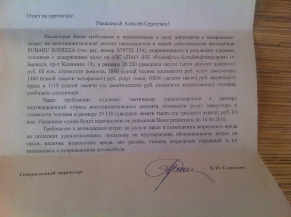 Дальше начался весь идиотизм с бумажками, все чеки мы забрали из сервиса и поехали в офис Роснефти. Первая поездка не удалась, мы приехали под конец рабочего дня и там просто некому было нас принять, уж очень сотрудники торопятся в пятницу домой и уходят даже пораньше… Едем к ним в понедельник, пишем претензии, прикладываем все имеющиеся чеки, подтверждающие наши расходы, плюс я требую возместить вдобавок моральный ущерб за все мои переживания, то время, которое я потерял отпрашиваясь с работы и занимался данным геморрой, а ведь его могло и не быть, если бы проводили профилактику и чистку резервуаров, а не клали деньги себе в карман. ИМХО.