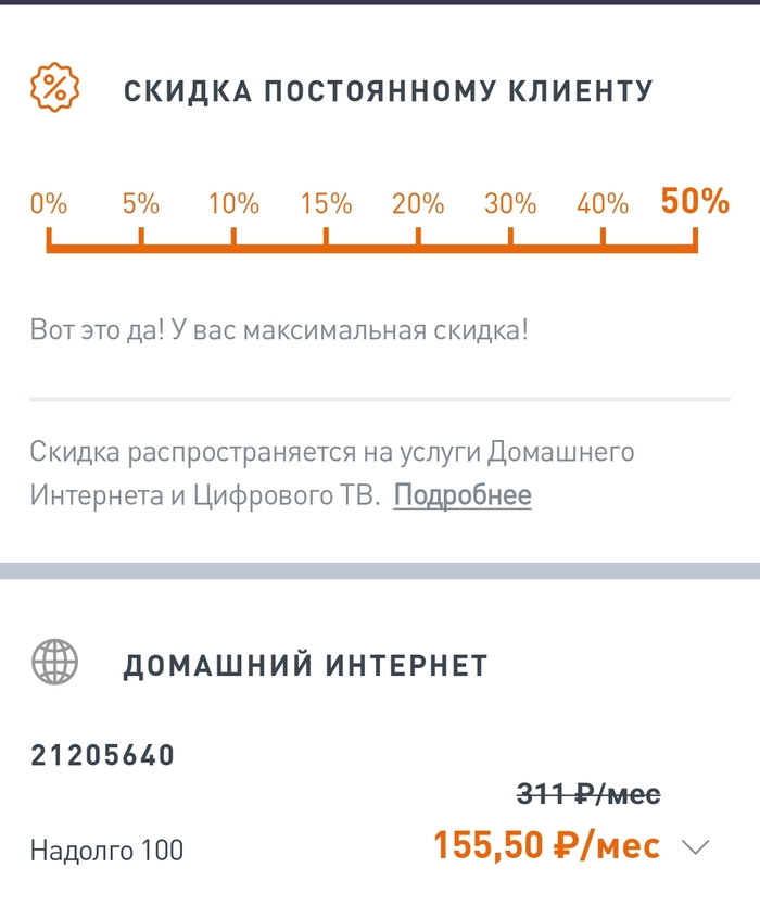 В далеком 2019 году я посрался с Ростелеком и был вынужден искать новую компанию для доставки интернета ко мне в квартиру. Помониторив предложения мой выбор пал на НетБайНет с такифом надолго, где первоначальная стоимость интернета в то время была выше рынка (типа у конкурентов около 400, здесь же 480), но чем дольше ты являешься пользователем тем больше тебе идет скидка на интернет... в итоге с февраля 2019 года до апреля 2023 года моя скидка достигла заветных максимальных 50 процентов и платил бы я 240 рублей и в ус не дул, но нет... ОПСОС посчитал, что рано я расслабился и повысил мой тариф на интернет на 50%. Выбора нет... я конечно останусь на этом тарифе, но 50%, мне кажется такое себе даже МТС не позволял, да и никто другой из всех ОПСОСов РФ. Далее картинки пруфов