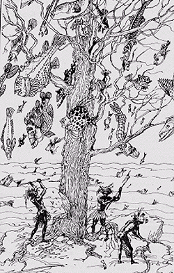 Пока дерево раскачивалось туда и сюда, с него осыпались плоды. Те, что упали в море, стали первыми морскими рыбами. А те, что попали в реку, превратились в первых речных рыб…»