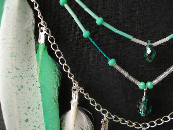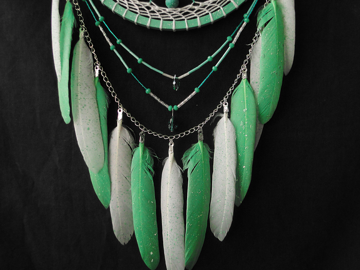 "Мята". Обруч нежного мятного цвета, в белую крапинку, деревянные бусины в паутине вручную окрашены под цвет обруча, в плетении и подвесах использовались японский бисер-стеклярус разных цветов и стеклянные граненые бусины; тонированные перья.