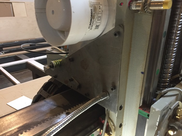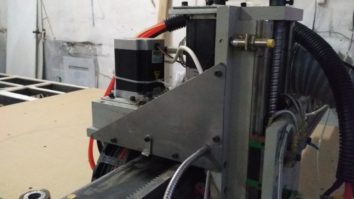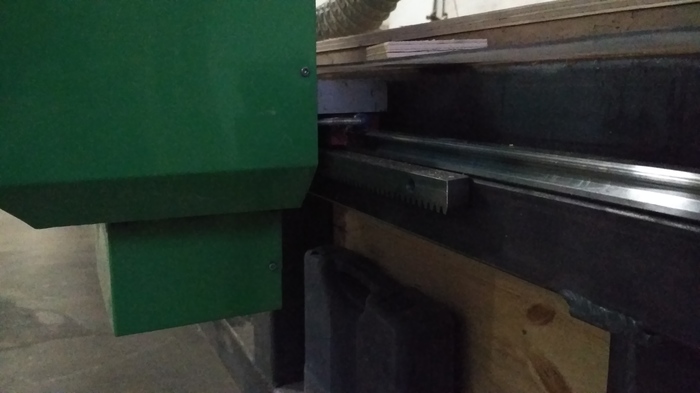 Для облегчения веса балки было принято решение вырезать с нее куски. Вырезали треугольниками, вроде на жесткости это никак не сказалось (я не заметил), зато веса скинули 30кг. Но случился нюанс, о котором перед резкой никто не подумал.. В балке были напряжения, которые вышли после того, как мы ее покрамсали))) А именно - ее слегка скрутило к концу.. Стало подкусывать на зубчатой рейке в самом конце. Пришлось сделать под рейку подкладку 0.5мм. На резке никак не сказалось.