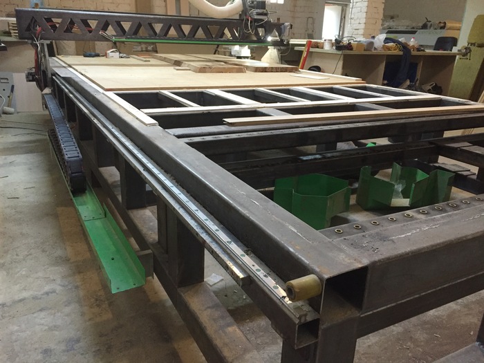 Как помнят мои подписчики, станок покупался малышом, с рабочим полем 1200х1200, чего хватало для мелкого декора (хотя и бесило фанеру пилить). Для Б2Б было решено, что необходимо поле 2х4. Ну а т.к. железо продается 6 метровыми хлыстами, а направляющие 5 метровыми, то и делать решили на всю катушку, т.е. 5 метров в длину. Оставшиеся 500мм рабочего поля было решено когда-нибудь под что-нибудь использовать, например под поворотную ось...