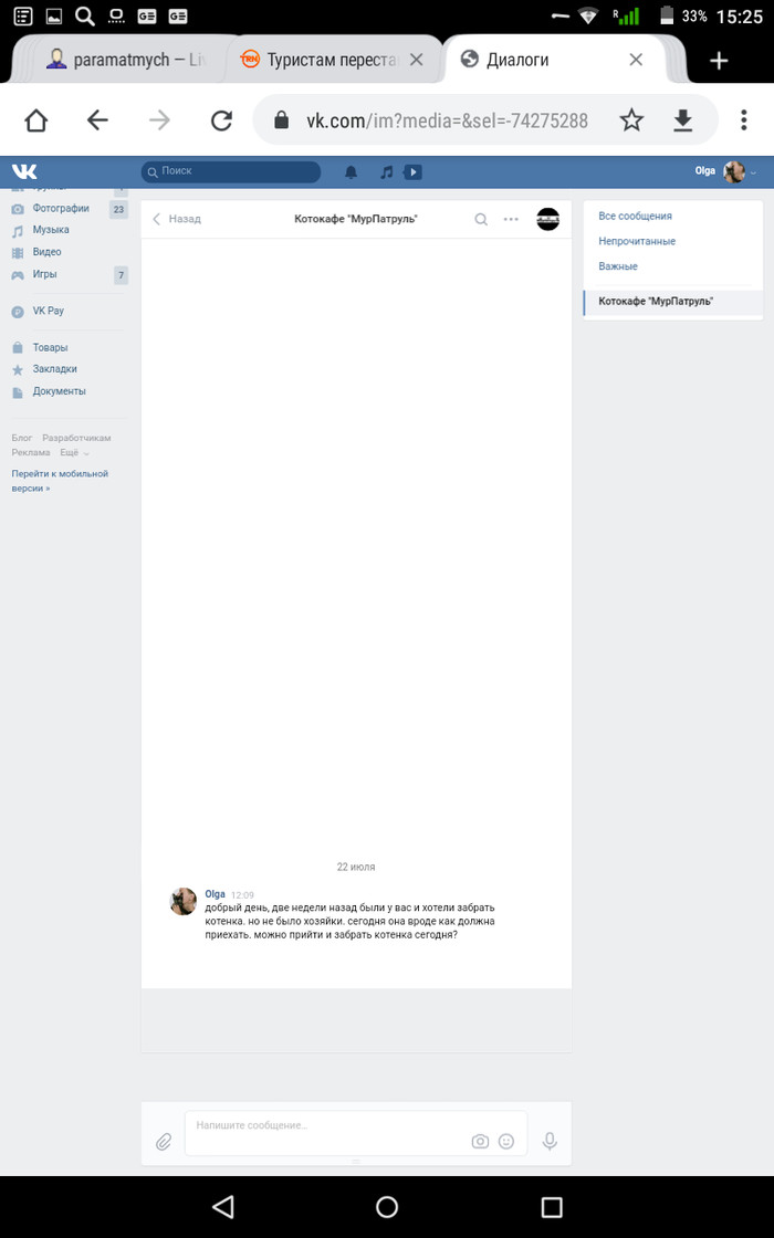 Боясь этой очереди желающих на беспородного котенка, мы поехали опять в это кафе. Там нам сообщить ли, что хозяйка приехала, созвонились с ней, по фейстайму она отказалась нас собеседовать, необходимо личное присутствие ее, звоните, договоритесь.