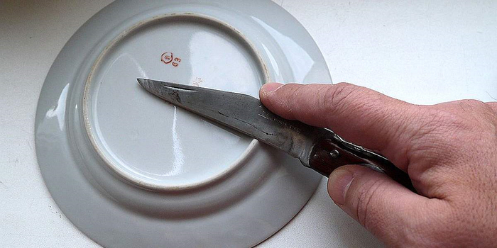 3. Часто рекомендуют точить ножи на перевернутом блюдце. И казалось бы вот оно. Дёшево и сердито. Но такая заточка не приводит к хорошему результату. Абразивная поверхность блюдца неровная и круглая. Затачивать нож и на ровных то и прямых камнях не каждый может. А уж на неровном донце блюдца не испортить режущую кромку это вообще эквилибристика высшего уровня.