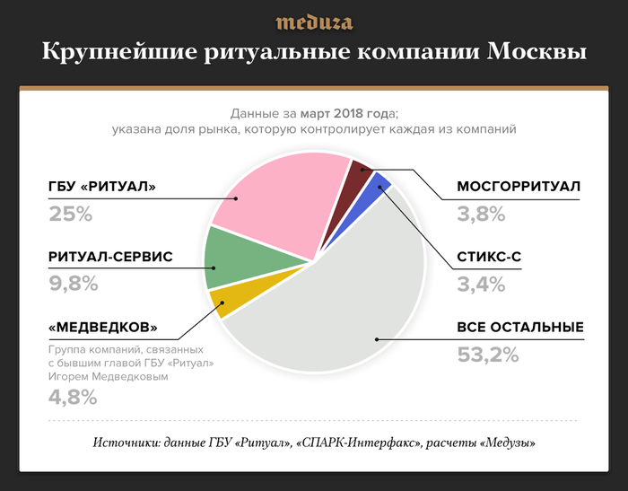 Ежегодно в России умирает около двух миллионов человек. Оборот похоронной индустрии только официально составляет около 60 миллиардов рублей в год; размер ее теневого сектора, по оценке властей, может достигать 250 миллиардов. За последние тридцать лет ритуальный рынок в России делили несколько раз — участвовали в этом и представители организованного криминала, и силовики, и государство. В результате в разных регионах постоянно возникают эксцессы: от перестрелки на Хованском кладбище в Москве до перекидывания трупов через забор в Екатеринбурге, несанкционированных массовых захоронений в Тольятти и суицида владельца кладбища в Омске. Спецкор «Медузы» Иван Голунов разобрался с тем, как устроен ритуальный рынок в России, — и выяснил, как контроль над ним постепенно переходил от людей, близких к криминальным структурам, к людям, связанным с государством.