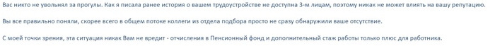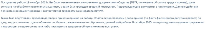 И не важно что я и знать не знала, что меня трудоустроят, и что они мне в уши лили, что если трудовой договор не утсроит, мои данные удалят, как-будто они обо мне никогда не знали. Я конечно ошарашена была таким ответом, там еще много чего было из разряда "сама виновата". Но не остановилась и попросила выслать мне тогда приказ об увольнении, чтобы я могла ознакомиться с причиной, т.к. ожидаемые прогулы причиной не являлись по их же утверждениям.