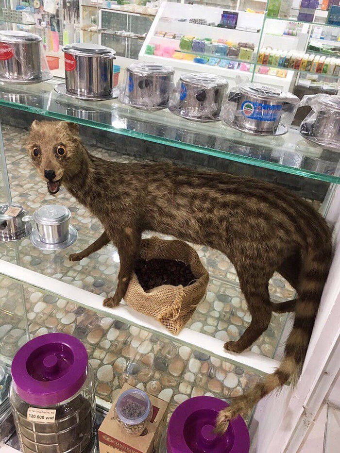Привет, такое чучело встретили с женой в Муйне, Вьетнам, это зверек мусанг, именно он ест зерна кофе и из его экскрементов делают кофе Лювак, один из самых дорогих в мире. Таксидермист очень точно передал эмоции животного, которое знает как делается кофе)