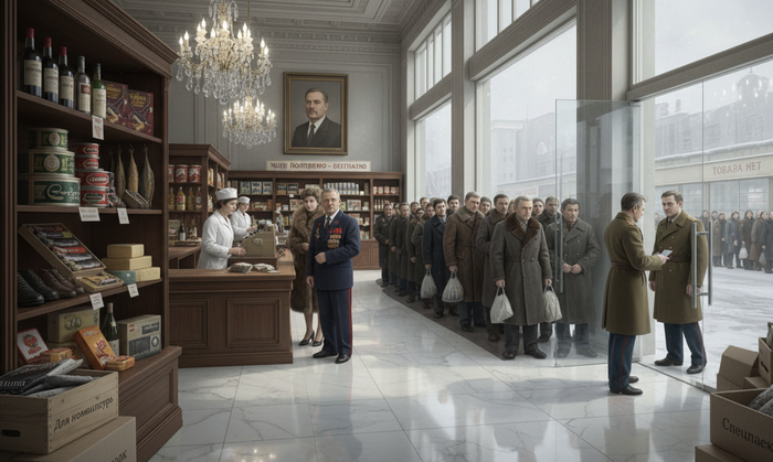 В брежневском СССР номенклатура жила в параллельной реальности. Пока простые граждане часами стояли в очередях за дефицитной колбасой, партийные чиновники отовариваись в специальных распределителях — закрытых магазинах, где на полках лежали импортные деликатесы, французские вина, швейцарский шоколад, югославская обувь и финская электроника. Спецраспределители действовали при ЦК КПСС, обкомах, горкомах и крупных министерствах.