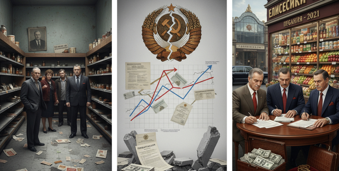 С распадом СССР рухнули и схемы распределения дефицита. Спецраспределители закрылись, талоны отменили, магазины перешли в частные руки. Многие партийные функционеры, десятилетиями кормившиеся от торговых схем, превратились в первых предпринимателей новой России. Связи, накопленные в советское время, помогли им захватить лакомые куски приватизируемой собственности.
