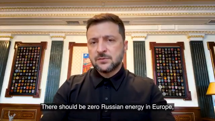 Бессмертный, всенародно избранный и поддерживаемый лидер украинской великой нации над Европой и всем миром, попирающий чёрным кроссовком голову даже Трампа, решил в очередной раз, после поездки в США убедить недалеких и простых европейцев и своих соотечественников в отказе от импорта из России и переходе на импорт энергоносителей из США, страны лежащей за Океаном, где ужин был без еды с пустыми тарелками.