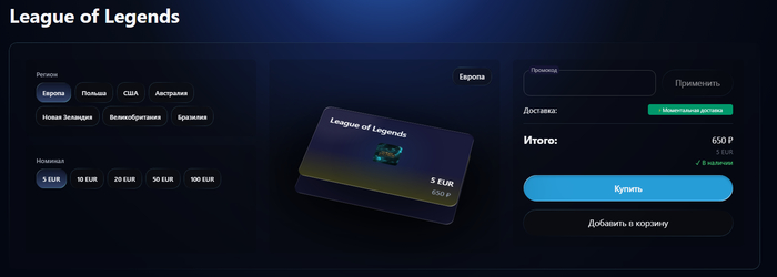 Регион League of Legends влияет на способы оплаты и работу кодов. Перед покупкой убедитесь, что выбранный способ или номинал подходит именно под ваш аккаунт.