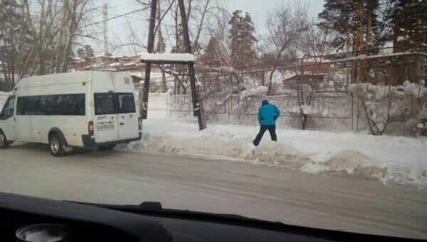 Водитель маршрутки, проехав остановочный карман, остановился, достал лопату и начал чистить карман от снега.