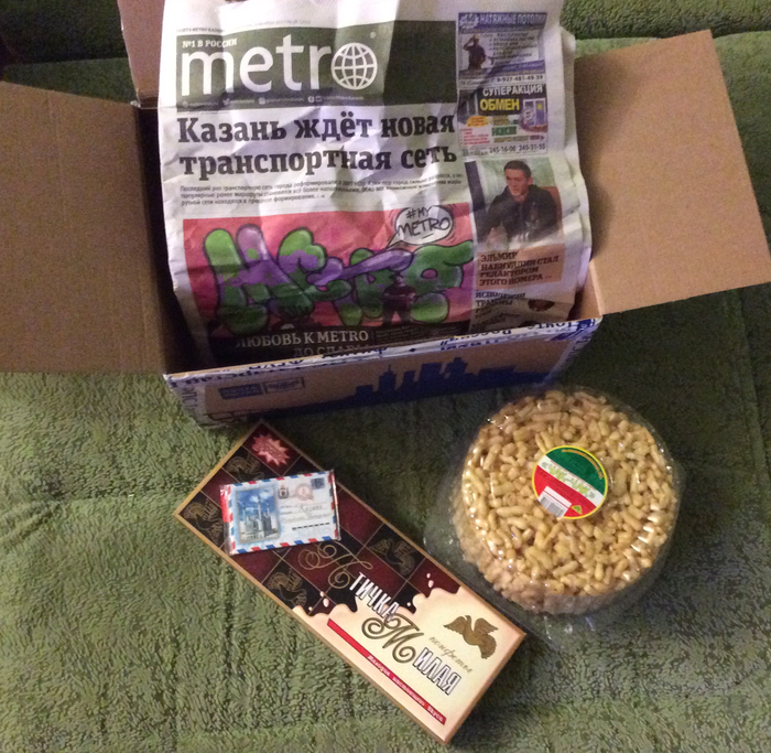Первое и самое классное - газета Метро Казань). Мы обменялись выпусками – в моей посылке, для уменьшения колебаний подарка внутри коробки, была газета Метро Москва. Дальше шли любимые конфеты мужа, мое любимое лакомство и магнитик. Попадание 4 из 4.