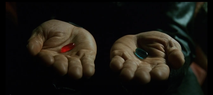 И кстати еще одна отсылка, жаль скриншотов сделать не успел. После этой миссии, ГГ может отдать свое тело Джонни Сильверхенду, после чего он уходит в полный отрыв - бухло, колеса, телки, драки и даже успеваем попасть в ДТП. И как раз во время всего этого, когда Джонни предлагают какие то таблетки, их показывают точь-в-точь как в том кадре.