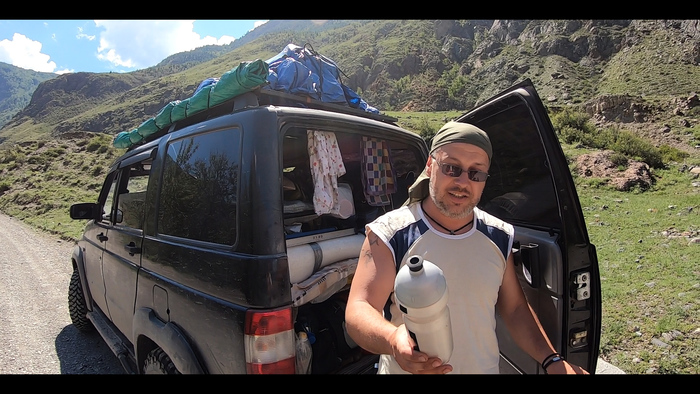 Отдыхал как правило на поворотах. И еще один раз пришлось отдохнуть, когда я упал и меня накрыло велосипедом. Проблема была даже не в большом весе (60+), а в том, что этот вес очень неудобный. Вот и я потерял на миг концентрацию и тут же был наказан. Каждый поворот я радовался, что успел набрать воды. Потому что не будь у меня воды, я бы просто начал просить её у проезжающих по перевалу машин, настолько хотелось пить. Благо в таких местах и условиях большинство людей отзывчивы. А ещё я чертовски радовался, что поднимаюсь в тени.