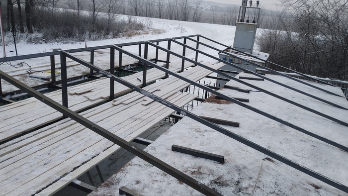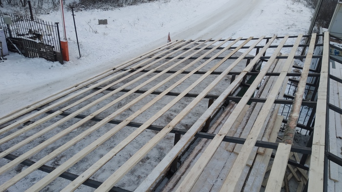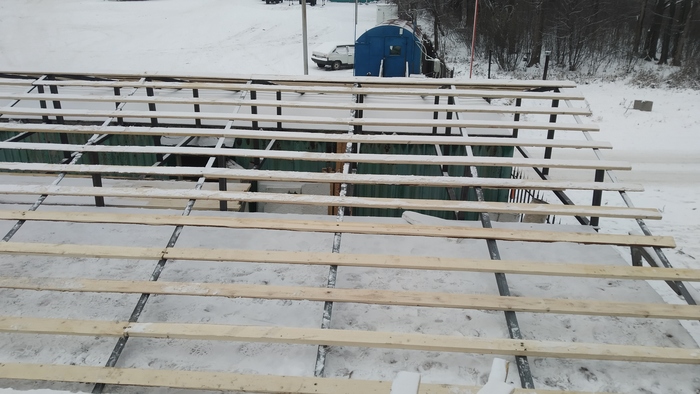 Дальше ставили центральные профили, на них укладывали уголки по всей длине крыши.