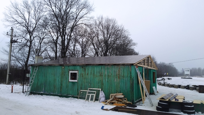 К истории. Имеем два вагона. Необходимо из соединить единой крышей. Выкинуть весь хлам из них. Демонтировать перегородки. Обшить все стены и потолок плитой OSB. Полы изначально планировалось закрыть линолеумом, в процессе линолеум поменялся на ламинат. Заменить старые деревянные окна на пластиковые. Снять старые двери и установить новые. Сделать отдельное помещение под туалет. Все снаружи закрыть баннером.
