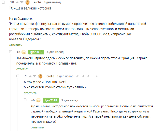 Хрен с этим "историком", однако же я и сам озадачился собственным вопросом. Действительно, СССР, США и Великобритания воевали с нацистами именно как ГОСУДАРСТВА - они победители без сомнений. Чего не скажешь о Франции и Польше. Да, и французы и поляки воевали с нацистами и в составе партизанских отрядов и в составе воинских частей, укомплектованных по национальному признаку. Но их страны были оккупированы и не участвовали в войне в качестве ГОСУДАРСТВ. Более того, они были освобождены силами армий других, вышеперечисленных, государств. Польские и французские воинские подразделения, которые участвовали в освобождении своих стран, всё же снабжались и экипировались за счёт других государств, действовали "на подхвате" и не сыграли важной роли в поражении нацистской Германии. Это исторический факт, при всём уважении к полякам и французам, которые продолжали сражаться, несмотря на полное поражение их стран. Причём, французы под командованием Де Голля внесли если и не весомый, то, как минимум, заметный вклад в общую победу. Заметный, прежде всего, французам. ))) Но всё же, понятно, почему Польша - не победительница. Но непонятно, почему Франция, вдруг, стала победительницей. И выяснилось, что опять "виноват" Сталин. Вот что можно прочесть в Википедии.
