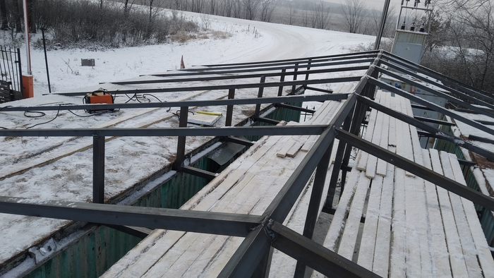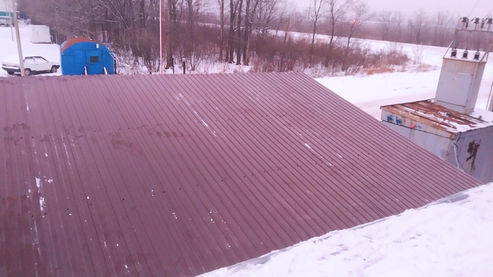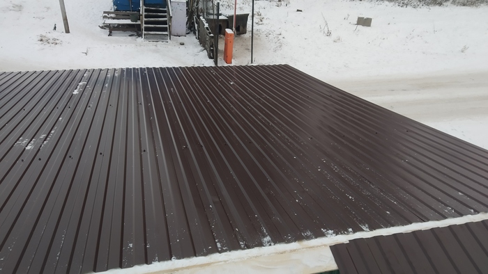 Параллельно с этим внутри все обшивалось OSB. Фото опять нет. Я работал на крыше. Дальше пришёл пришёл профнастил, и мы начали его естественно укладывать. Удивительно.