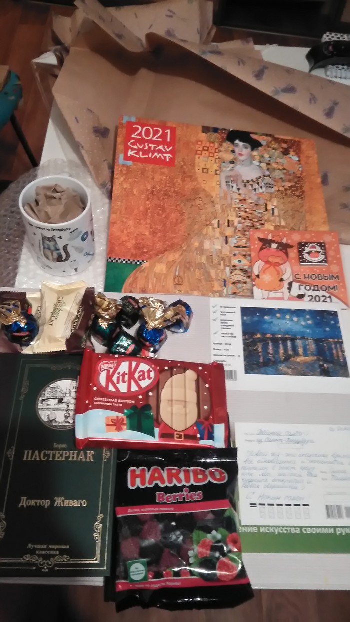 Мой первый опыт участия в проекте, очень переживала, но зря 😊. Все просто замечательно. Получила свой подарок из Санкт-Петербурга от замечательной снегурочки Екатерины. Эмоции переполняют через край до сих пор. Подарок подобран полностью по моим интересам и ожиданиям. Картина по номерам "Звездная ночь над Роной" Винсента Ван Гога, календарь с картинами Густава Климта - это просто мечта😍🙌. Очень стильно и красиво оформлен и очень трогают памятные сувениры из прекрасного города Санкт-Петербурга, а также открытка с поздравлением😆😆😆. Все дополняет друг друга книжка, альбом для монет и конечно сладости 😍😍😍. Спасибо прекрасной Екатерине за эти мгновения счастья в моей жизни, а также возможность почувствовать себя ребёнком, каждая частичка этого восхитительного подарка вызывает самые искренние и детские чувства 😘😆