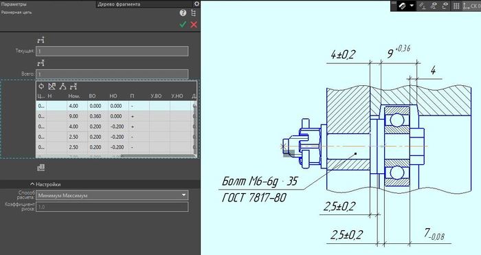 В Компасе есть встроенное приложение для расчёта размерных цепей причём прямо на чертежах, но тут тоже есть существенные недостатки, из-за которых я отказался от этого способа. Для правильно расчёта в нём, цепи должны быть замкнуты (то есть каждая последующая размерная линия должна точно примыкать к прыдыдущей). Сложности с диаметрами, которые нельзя включить в расчёт, надо переделывать рисунок под линейный размер. Да и считает он, судя по всему только простые цепочки - когда есть последовательность размеров, а надо найти суммирующий размер и его допуски. Если размерная цепочка сложная, меняет направление, то Компас начинает тупить и неожиданно завершать цепочку. К тому же для правильного расчёта нужно, чтобы размеры на чертеже были 1 к 1, а когда идёт проектирование, в том же Маткаде гораздо удобнее "поиграть" размерами и допусками, чтобы выбрать оптимальную конструкцию. В Компасе ради этого приходится переделывать половину эскиза, это неудобно. Отчёт Компас сохраняет в текстовом виде, что тоже, по-моему, неудобно.