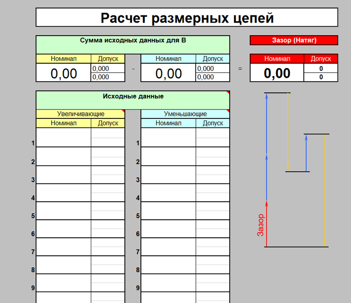 Первая найденная программа мне не понравилась тем, что там надо было увеличивающие и уменьшающие звенья вводить в разные столбцы и от этого терялась наглядность цепочки размеров, когда они идут друг за другом. К тому же надо каждый раз соображать какое это звено.