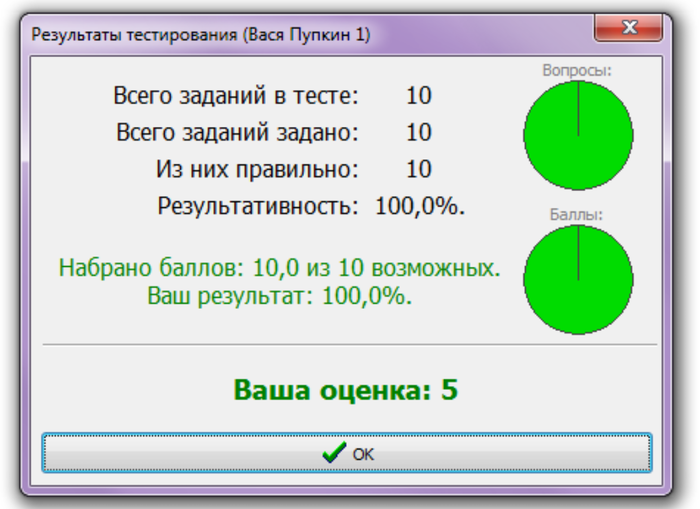 Сделал скрин рабочего стола с тестом, открыл через Paint и перекрасил красный цвет ошибок на зеленый, 100% результат, количество правильных ответов и оценку отрисовал по пикселях, готовый результат поставил на фон рабочего стола и закрыл программу.