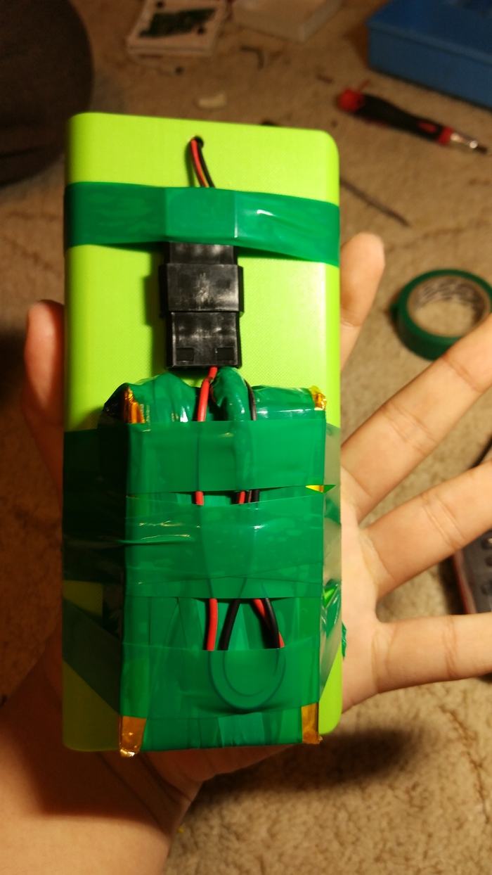 Примотал АКБ к корпусу для единости конструкции. И получилась импровизированная бомба банка повышенной емкости 36 000 mAh