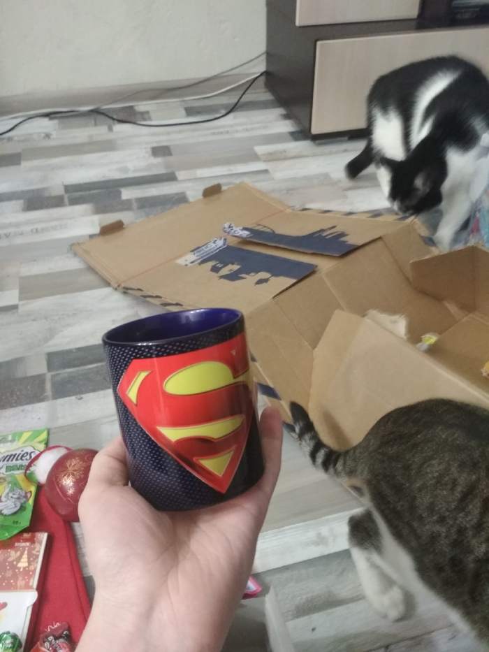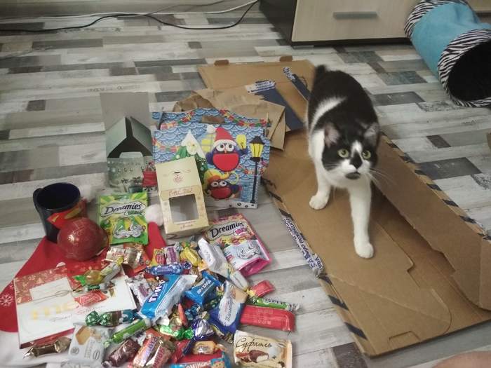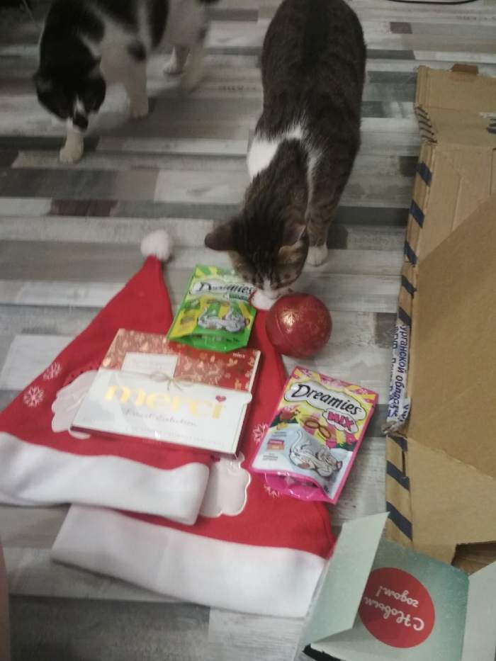 2 новогодние шапочки, лакомства человекам и котикам, а также новогодний шар с чаем внутри :)
