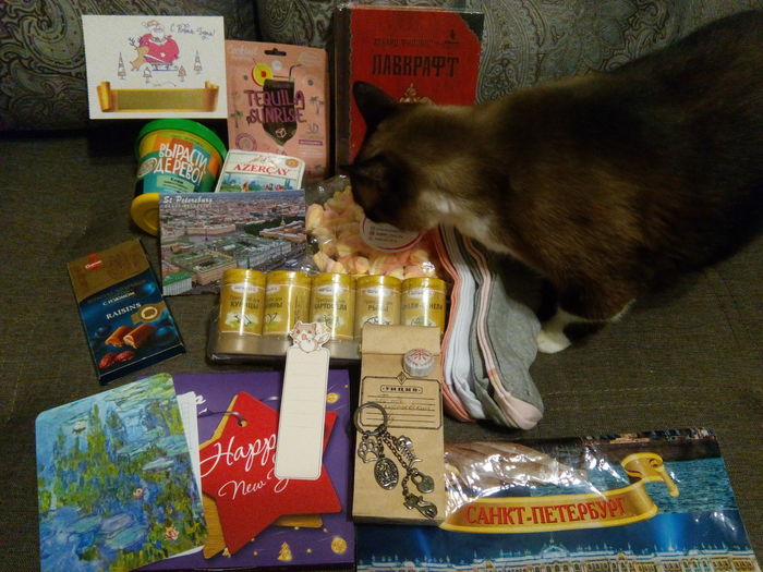 Маршмеллоу, красивые открытки, вкусный чай разных сортов, шоколадка, конфеты, специи (я люблю готовить), красивые носки приятные на ощупь (как и было написано в пожеланиях), "Некрономикон" Лавкрафта, закладка и красивый брелок с котиками, киви!