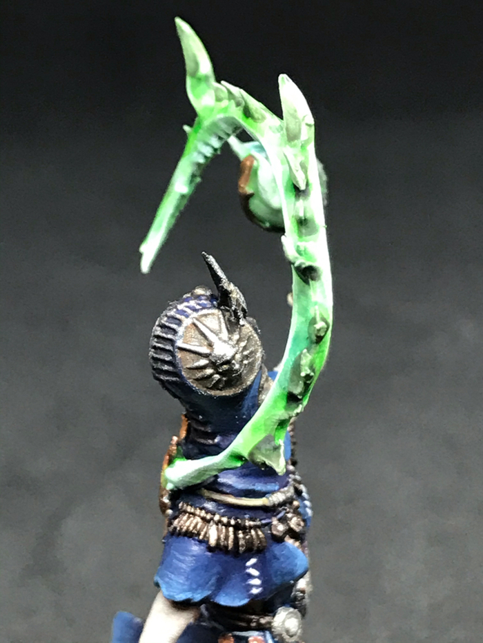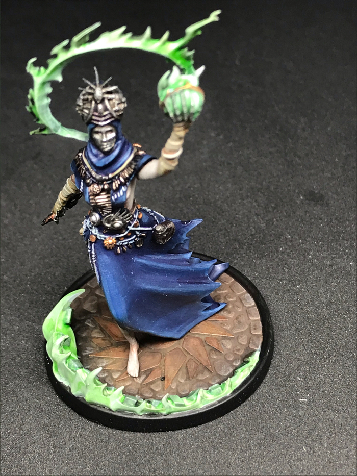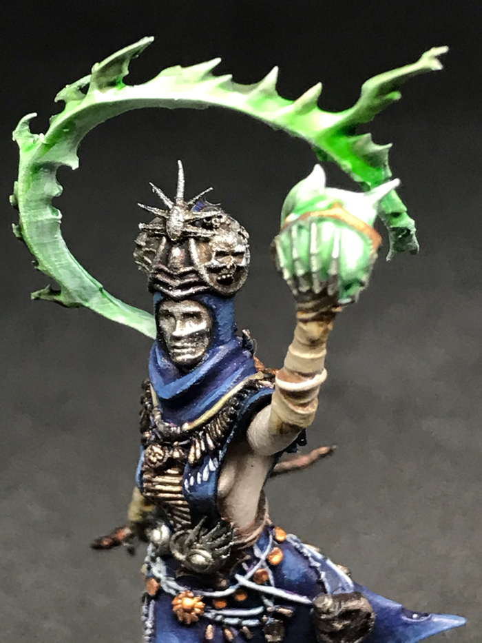 Вторым моментом, который меня озадачил, стал выбор цветовой схемы. Раньше я всегда экспериментировал в рамках советов от GamesWorkshop и всегда знал, какая у меня будет проливка, какое высветление будет первым, какое финальным. Вопрос лишь в деталях: где именно будет костяной, где серебряный, а где - красный. Тут появилась свобода выбора, с которой пришлось поломать голову, ибо я боялся сплоховать, а отмывать миниатюры я страшно не люблю. Итог мне понравился, хотя сделать свечение глаз у маски я очень хочу, но пока опасаюсь ща результат. Кое-где хотел сделать украшения с драгоценными вставками, но решил этого не делать, в угоду однотонности, которая, на мой взгляд, дает более мрачный эффект, хотя и скучноватый.