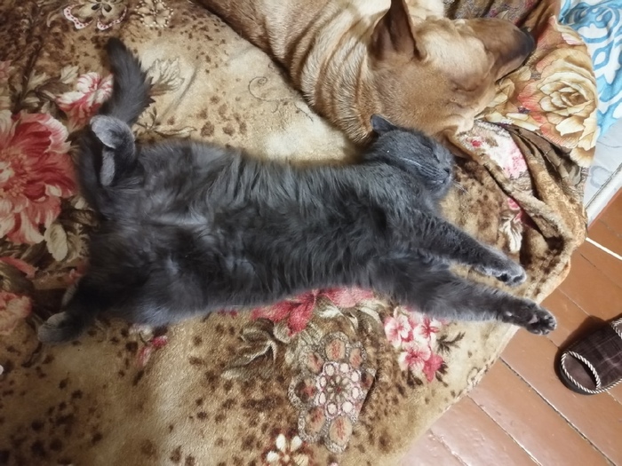 Первые дни Матильда только спала и ела, но сейчас расслабилась, это у нас кошка-боевик) Поэтому пристраивается единственным животным для ее и вашего спокойствия.