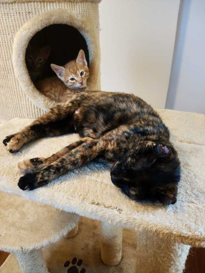 В общем, ближе к лету 2019-го мы все вместе (я, муж и кошка)) переехали за город, в Подмосковье. Китти по достоинству оценила преимущества свободного выгула на улице и вот тут заверте...))) Сразу хочу уточнить: мы были готовы к тому, что произойдет и осознанно дали ей загулять с соседским шикарным породистым рыжим котом. 13 сентября (в пятницу 13-го, уууу))) появился результат: