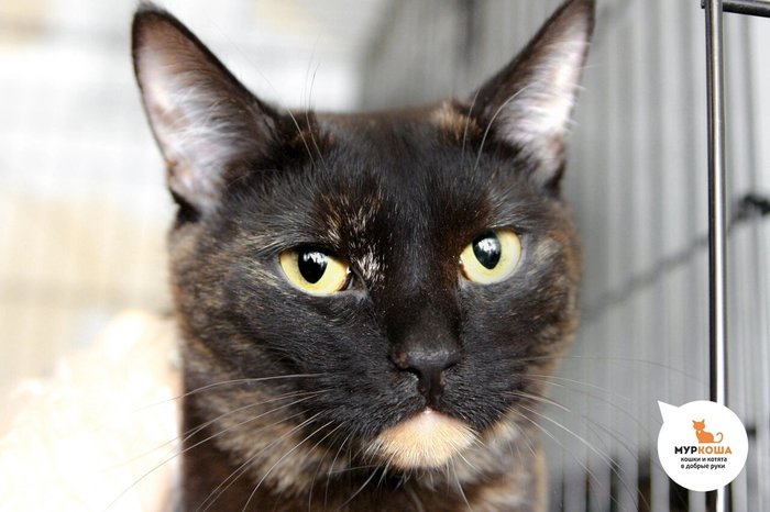 Кошечка Лумпа – обладатель интересного черепахового окраса с чёрной маской. А какой у неё внимательный взгляд! Это чтобы активно и деловито разглядывать новых хозяев. Однажды кошечка уже высмотрела их, но вернулась к нам из-за проблем со здоровьем хозяев.