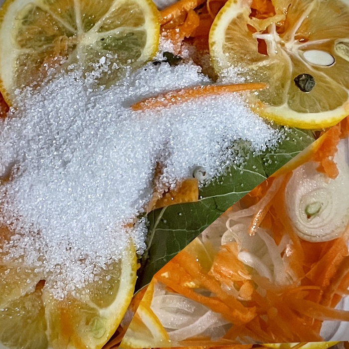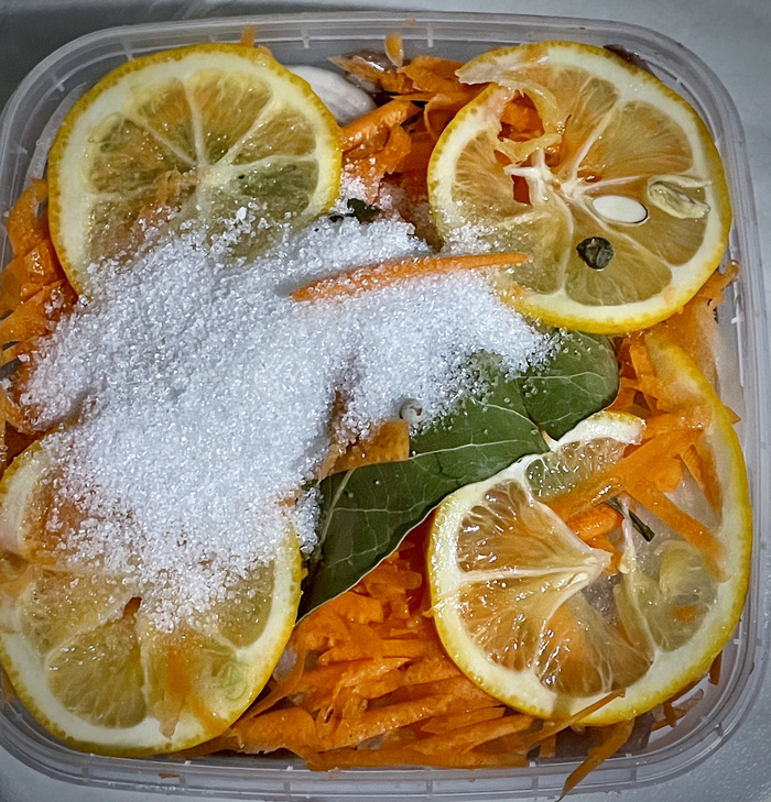 Лимоны помыл и нарезал кружочками. Морковь очистил и натёр на крупной тёрке. Если кому лень тереть, нарежьте тонкими кружочками. Лук очистил и нарезал кольцами. Вот и вся подготовка.