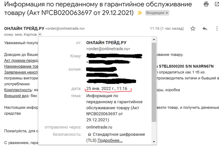 И самое главное (и, забегая вперёд, результативное) - я отправил подробное описание ситуации производителю (Seagate). Производитель откликнулся очень оперативно, переписка велась 31 декабря во второй половине дня. Через пару дней, уже в новом году, они мне прислали подтверждение того, что мне одобрена замена диска.