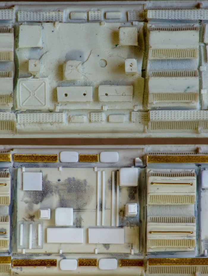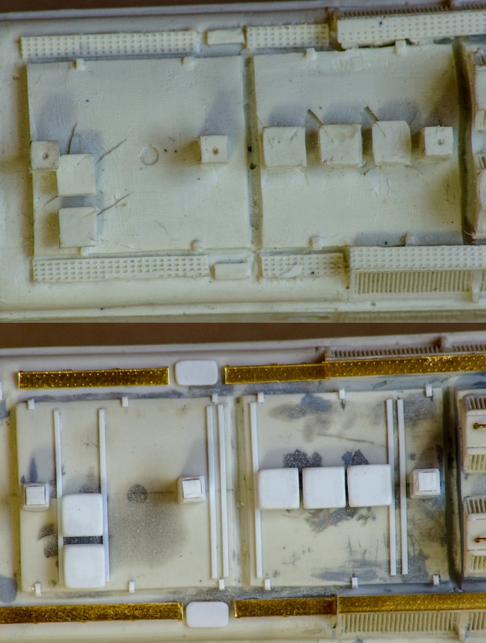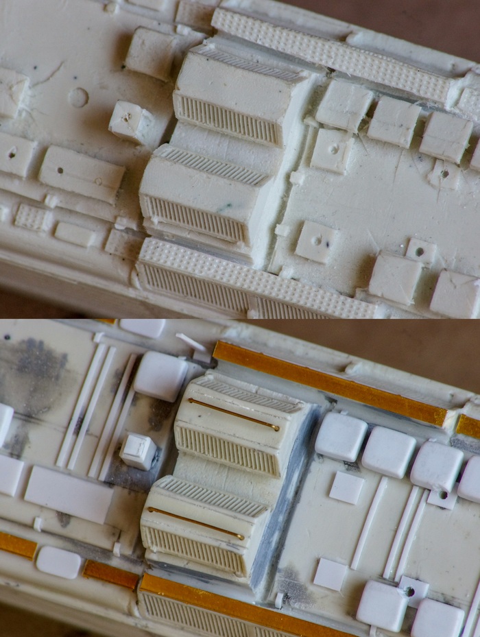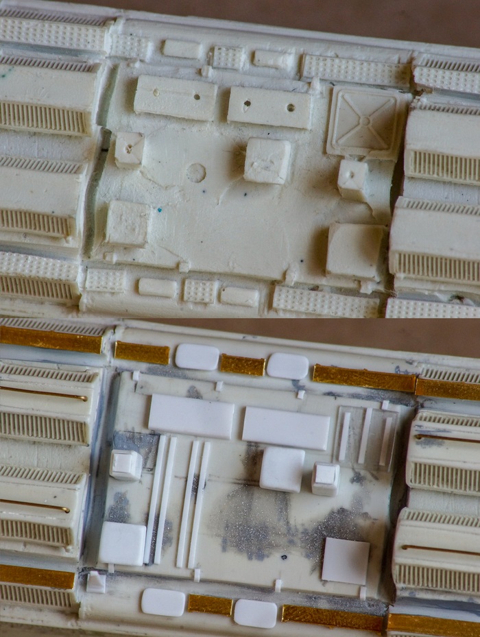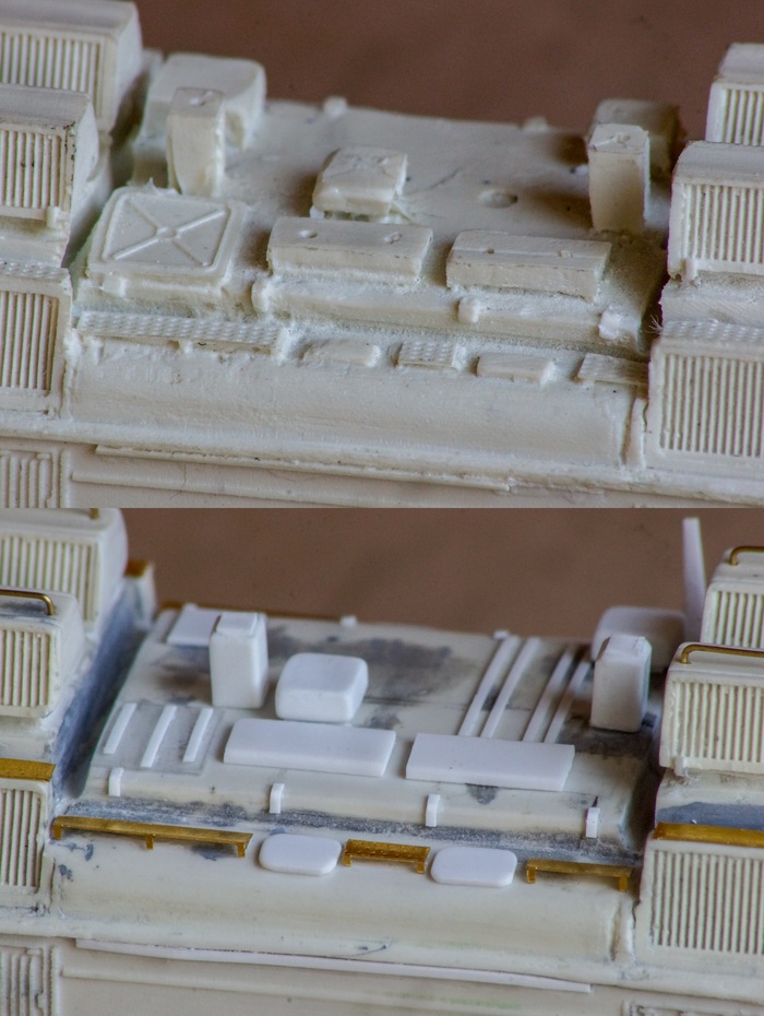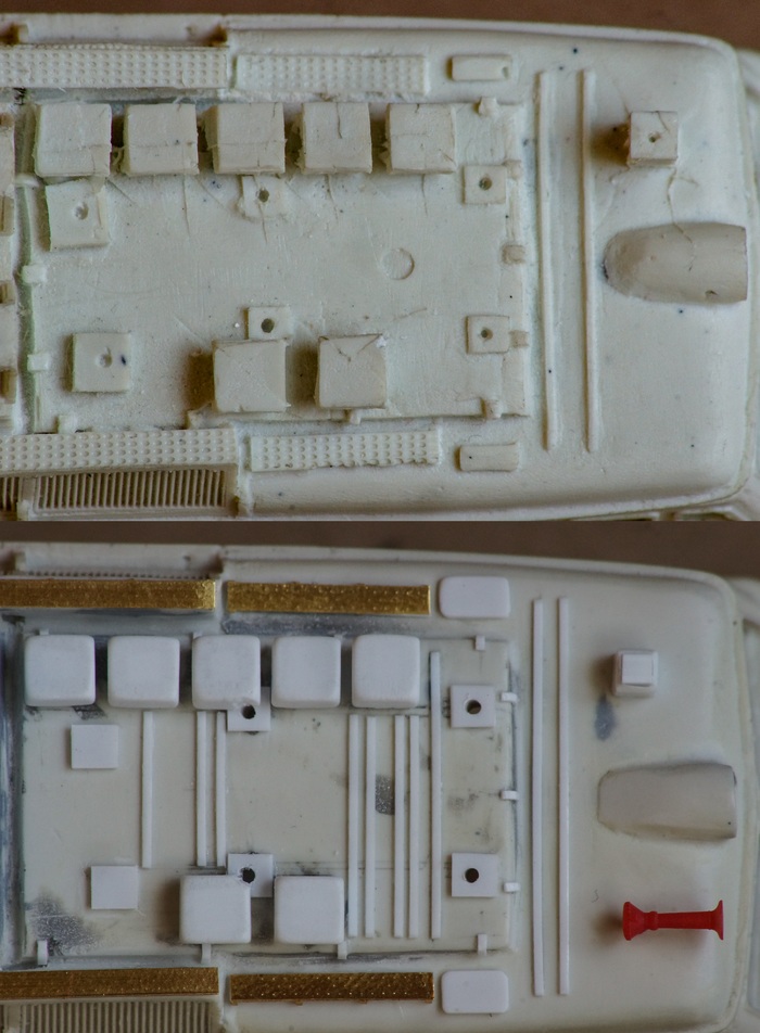 Вооружившись чертежами и фотографиями начал восстанавливать элементы крыши. Для этого использовал пластиковый профиль фирмы Evergreen. Изобилие ассортимента позволило приобрести необходимые профиля с готовыми габаритами, оставалось только нарезать их как колбасу, зачистить грани и посадить на место согласно чертежам.