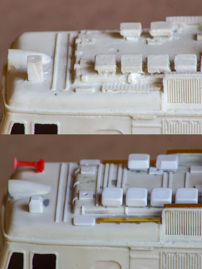 Взяв корпус этого локомотива в руки, был поражен его милыми очертаниями. Увесистый корпус из смолы, со стенками в 5мм, так и говорили:"Я ничего не боюсь в этой жизни!". Ровные линии боковых панелей так и манили провести по ним пальцем, получая удовольствие от касания. Но, при виде крыши и крышного оборудования, внутри что-то сломалось, и спустя несколько секунд зажглось желание срезать всё лишнее и самостоятельно изготовить все элементы.