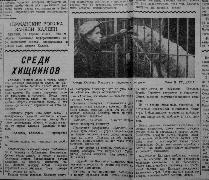 Чтобы руководить секцией хищников, нужно быть исключительно смелым человеком. Вот какой случай произошел с Семеном Юльевичем Канцлером. Об этом случае напечатали в газете.
