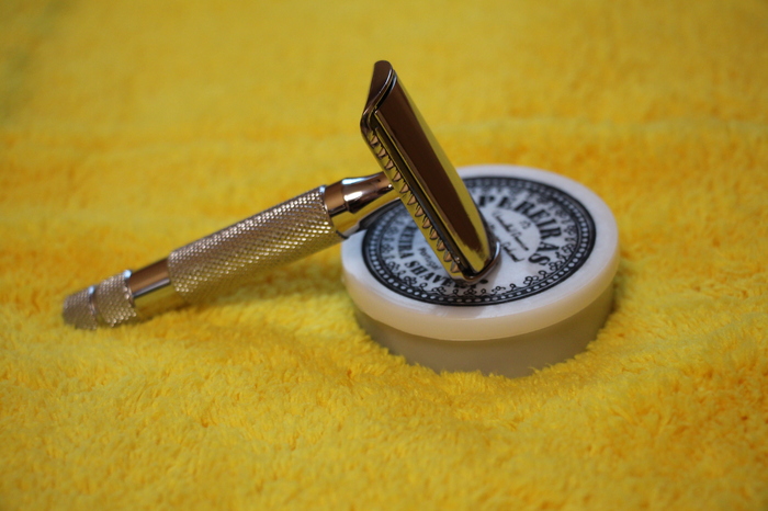 Лезвие поставил Gillette Platinum, мыло использовал Pereiras с углем. Вылет лезвия у станка довольно большой, поэтому в процессе бритья лезвие как будто вибрирует, но это только на первом проходе, щетина срезается довольно с громким звуком, далее лезвие практически не ощущается, но и комфорта в бритье особого нет. Геометрия станка не особо продумана. Побрился я за 3 прохода, абсолютно чисто в BBS, без порезов и раздражения кожи, эпидермис не поврежден.