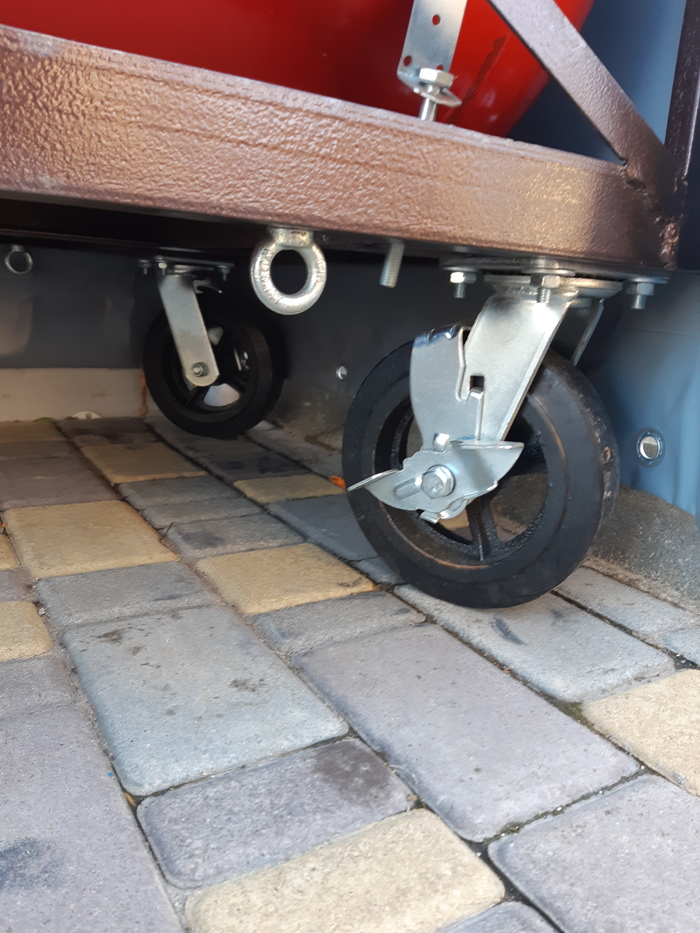 Изучив рынок ГБО, нашел для себя оптимальный вариант- 4 шт БАЖ-137. Это баллоны диаметром 36см и вместимостью до 137 литров. Были закуплены баллоны и я приступил к изготовлению рамы для баллонов. Конструкцию необходимо было сделать максимально прочную и в тоже время легкую. Делал из уголка 50х4мм, по углам 63х4мм, каркас для тента и внутренние направляющие для баллонов 20х3мм. Каркас варил сам, отдал только на покраску пульверизатором в цех. Т.к. все это нужно было перемещать как-то, приобрел грузовые поворотные колеса с тормозом.