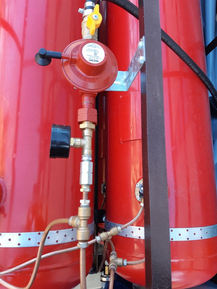 Установил и закрепил баллоны под углом 30гр. На мультиклапанах загнул расходную трубку вверх- важно чтобы через нее шла только газообразная фаза пропан-бутана, как на обычных бытовых баллонах. Тут есть два варианта- сделать отбор паровой фазы сверху баллона или же брать жидкую фазу СУГ и через испаритель получать газообразную. Готовые испарители стоят от 15тр. Также они потребляют электроэнергию и им требуется какое-то время для запуска. Можно собрать такой испаритель самостоятельно, но я решил брать именно паровую фазу.