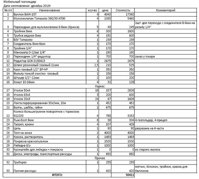 Ну и собственно, сколько мне вышло все это. 31тр- сам газгольдер и 19тр- каркас и крепеж. Детализация в табличке.