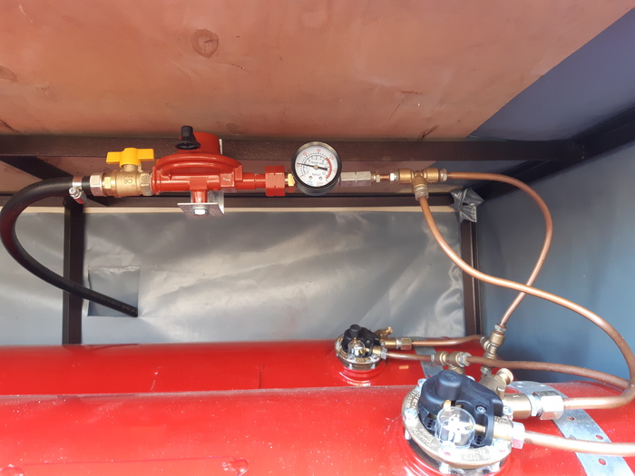 Больше всего я опасался накосячить при обвязке медной трубкой. Ранее я не имел дела с такими соединениями. Даже заехал к установщикам ГБО и предложил им выполнить эту работу (заодно оплатить у них необходимое кол-во медной трубки). Одни не смогли мне сказать, сколько это будет стоить, вторые сказали, что там ничего сложного нет и отправили меня делать все самому, предварительно снабдив меня инструкциями и телефоном поставщика, который отрежет мне медную трубку столько, сколько мне нужно (остальные продавали бухтами по 50м). И вот собрал я всю конструкцию, она замечательно ездит на купленных колесах по двору. Теперь нужно все это испытать на герметичность и водрузить на прицеп.