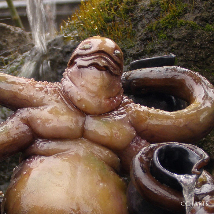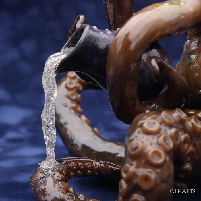 Вода в кувшинах сделана их эпоксидного клея. Наращивала клеевую сосульку из горлышка кувшинов; размазывала клей по полиэтилену, и потом, пока не совсем засохло, формировала поверх сосульки широкую струю. Сверху заравнивала свежим клеем. Сейчас уже вижу, как можно было бы сделать еще лучше, но поздно. Применю на следующем проекте, если понадобится.
